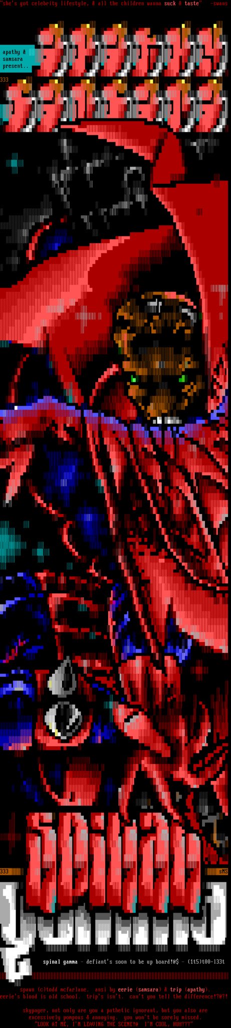 Spinal Gamma —- #Spawn #ANSI by Trip // Apathy & Eerie // Samsara (1997)@_______33______ #ansiart #ascii #asciiart #pixelart #textmode #textart #text #art #demoscene #bbs #typography #graffiti #graffitiart #imagecomics #image30thanniversary #comics #comicbookart #toddmcfarlane
