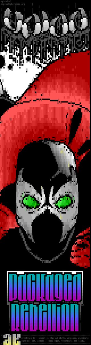 Packaged Rebellion —- Spawn ANSI by Asylum, logo by BoA // UNiON (1995) —- #ansiart #ansi #ascii #asciiart #pixelart #textmode #textart #text #art #demoscene #bbs #retrocomputing #retrographics #graffiti #graffitiart #imagecomics #image30thanniversary #comics #comicbookart #spawn
