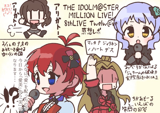 ミリオン8thライブ、2日目も個人的思い出感想イラストを描きました。 例によって描き切れなかったですが、いちぽむの君明日、ゲッサンミリオンを踏まえた「カッコいい曲、明るい曲、優しい曲」の流れが天才的演出で、ぴょんさんが心底楽しそうだったのも最高でした。 #imas_ml_8th #imas_ml_8th_day2