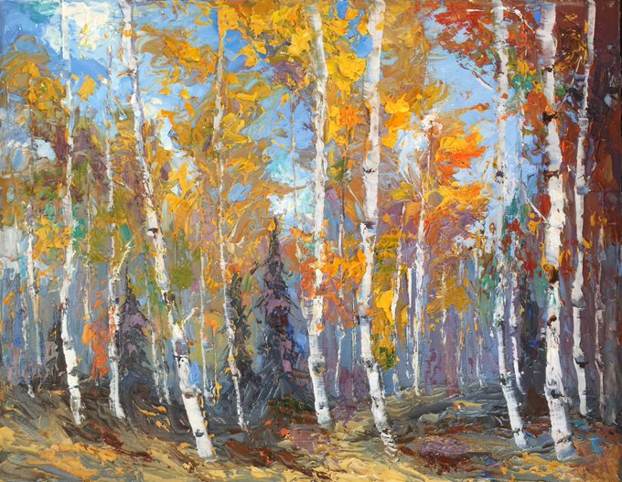“Evening in the Aspens”7x9 palette kinfe oil painting by Peggy Ann Thompson #art #artwork #ArtistOnTwitter #artist #painting #fineart #impressionism #oilpainting peggyannthompson.net
