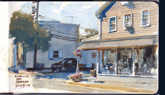 E. Main Street, Port Jefferson, NY. YouTube video: youtu.be/F5RZJuAfoxk #urbansketchers #watercolorpainting #realistart #impressionistpainting #pleinairlife