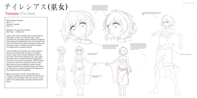 Teiresias reference sheet with story elements. #artistontwittter #anime #indie_anime #イラスト #rkgk #エリニスと巫女