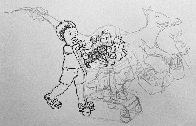 ディノケイルスとお買い物 ゴールデンウィークの思い出は、 以外にも、家族でどこかに出かけたとかじゃなく、子供たちと近所のスーパーに買い物に行って、ワイワイ好きなものを買ったことだった。 幸せは身近にある。 #inkpendrawing #お絵描き #買い物 #drawing #Deinocheirus #ディノケイルス