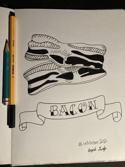 インクトーバーの続き描きました🙌 Day 28:CRISPY カリカリベーコンのお泊まり会 「こんど なにパンにねてみたい?」 #Inktober #inktober2021 #inktober2021day28