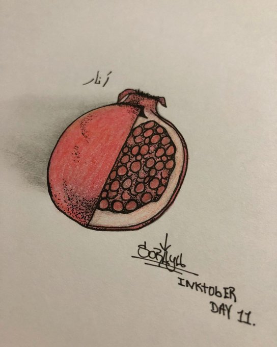 Day 11. Subject; Sour. In Iran this is a common fruit to find and it’s called “انار” (Anar) the actual pomegranate. They make sour rolls with this ‘Lavashak’. #Inktober2021 #inktober #inktober2021sour #fruit #pomegrenate #artwork