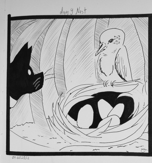 Day 9 Nest for @inktober Hey guys! I finally managed to keep up with the days. I am very happy about it. ~wixobemk #inktober #inktober2022 #inktober2022day9 #inktober2022day9nest #nest #cat #bird #inkart #inkwork #pensildrawing #eggs #art #pencilart #penartwork #traditionalart