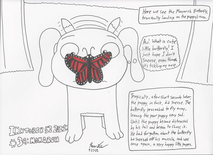 Here we see this week's #inktober52 #comic with Sam and a little tiny: Monarch. #inktober52monarch #inktober2021 #inktober #art #artwork #drawings #artoftheday #penandinkdrawing #minchopigmentliner #sharpieart #sharpiedrawing #thesecretbeauty