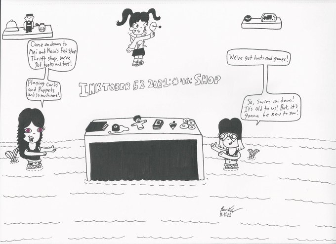 In this week's #inktober52 #comic, we swim on down to Mei and Kaia's Fish Stop Thrift: Shop! #inktober52shop #inktober2021 #inktober #art #artwork #drawings #artoftheday #penandinkdrawing #minchopigmentliner #sharpieart #sharpiedrawing #themagicalandadventure