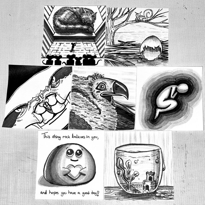 A week's worth of art. Hard to think it's been 7 days already! 24 more to go~! Probably can't fit all of them on my desk by the time we're done.. #inktober #inktober2022 #inktober22 #inktober2022week1 #inktobercompilation
