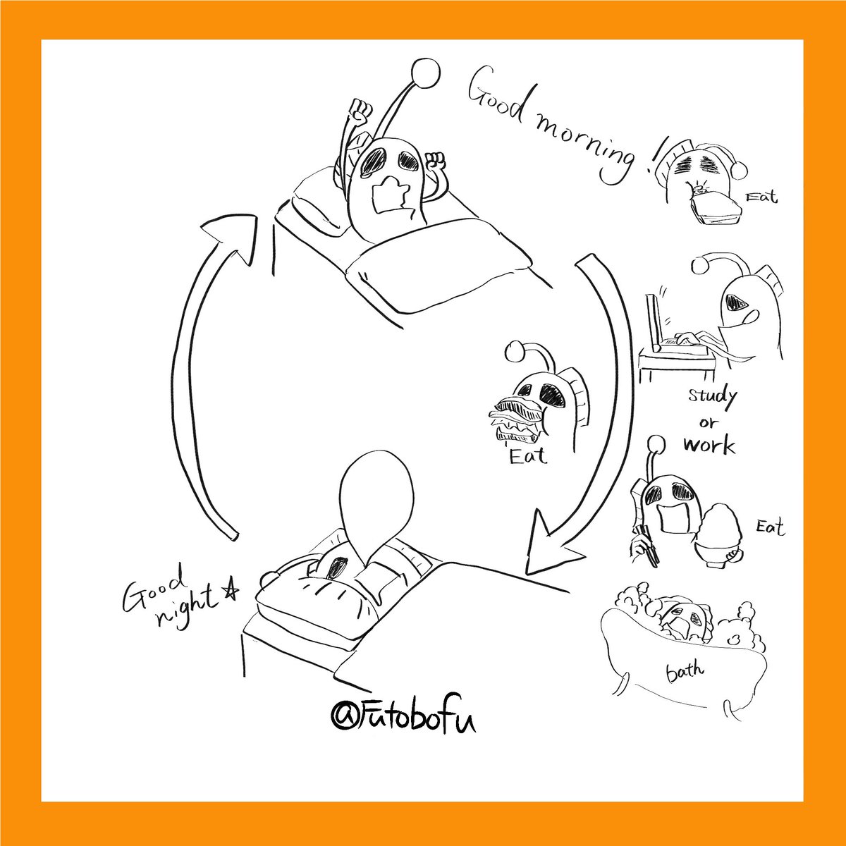今日のお題は「輪、ループ」だよ〜 大体一日の流れってこんな感じで続く #ゆるいイラスト #イラスト #illustration #inktober #inktober2021 #inktoberday19 #inktoberday19loop