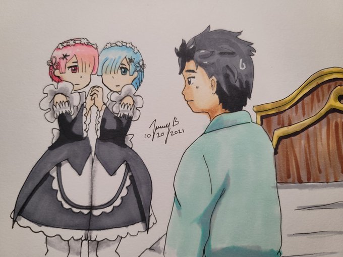 Inktober Day 19: Loop Re:Zero Groundhog's Day! #rezero #rem #ram #subaru #inktober #inktoberloop #Loop #inktober2021 #copic #Micron #prismacolor #anime #manga #animegirl
