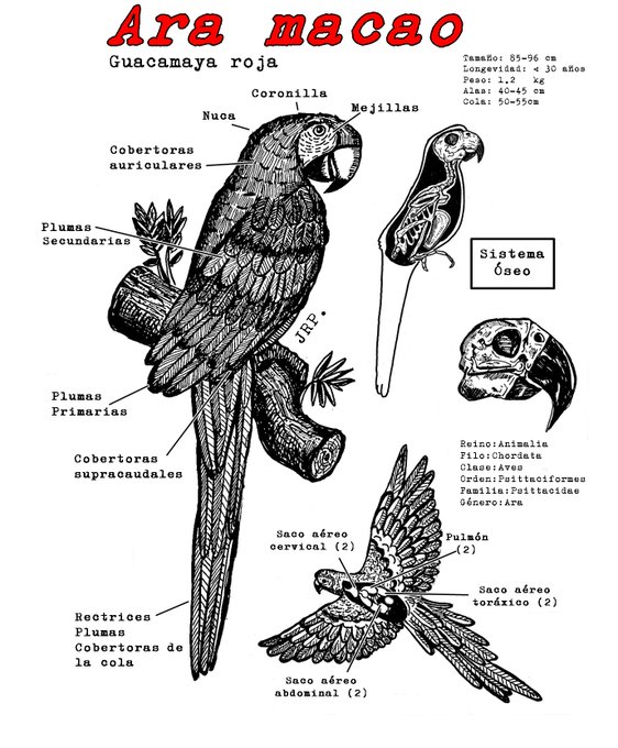 Día 6, #inktoberpanda. Soy Joel (instagram.com/joel_bio_ilust…), ilustrador y divulgador de la ciencia y les presento a la guacamaya roja (Ara macao). Esta bella especie es gravemente amenazada por la cacería y comercialización ilegal. #Inktober