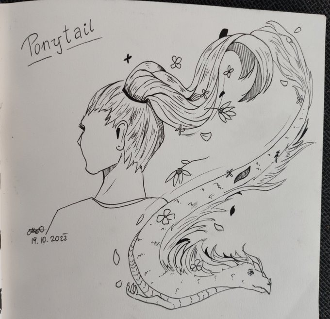 Two Inktober Posts in one day?! ...yeah I need to catch up with posting. With ponytail I thought of a ponytail, then a little winddragon swooshing through it ☺️ #inktober #inktober2022 #inktoberday19 #inktoberponytail