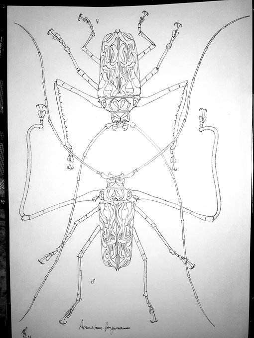 E no sétimo dia ele desenhou!!!! Kkkkkkkk Desafio @BugBitesPodcast dia 7 Arlequim-da-mata (Acracinus longimanus) um dos besouros mais lindos do Brasil e que está tão difícil de ver devido a perda de hábitat. Mostra dimorfismo sexual. #insektober #insektober2021 #inktober2021