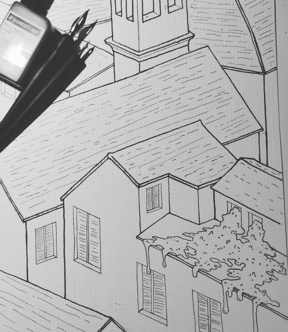 Day 13, en esa buhardilla se cuece algo! #roof #inktober #inktober2021 #monster #darkness #magic #bnw #lovecraft #investigation #challenge #adventure #ancient #monster #creature