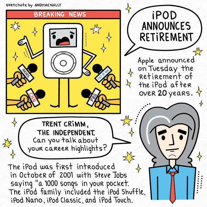 iPod Retirement. Apple announced on Tuesday the retirement of the iPod after over 20 years of production. #sketchnotes #illustration #conceptsapp #apple #ipod #ipodretirement #trentcrimm #theindependent #appletv #tedlasso