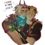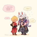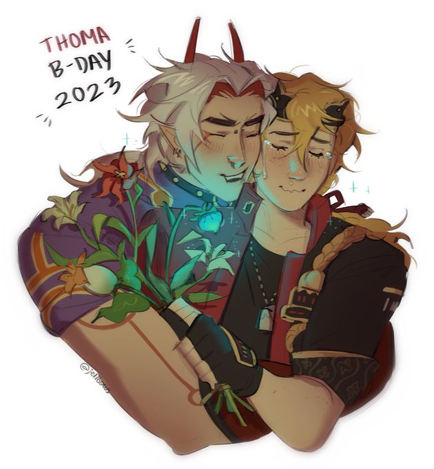 it's the 9th here so it's thoma's bday!! 🎂 itto got him some mondstadt flowers heheh the sillies #itthoma #thoma #aratakiitto #genshintwt #トーマ生誕祭2023