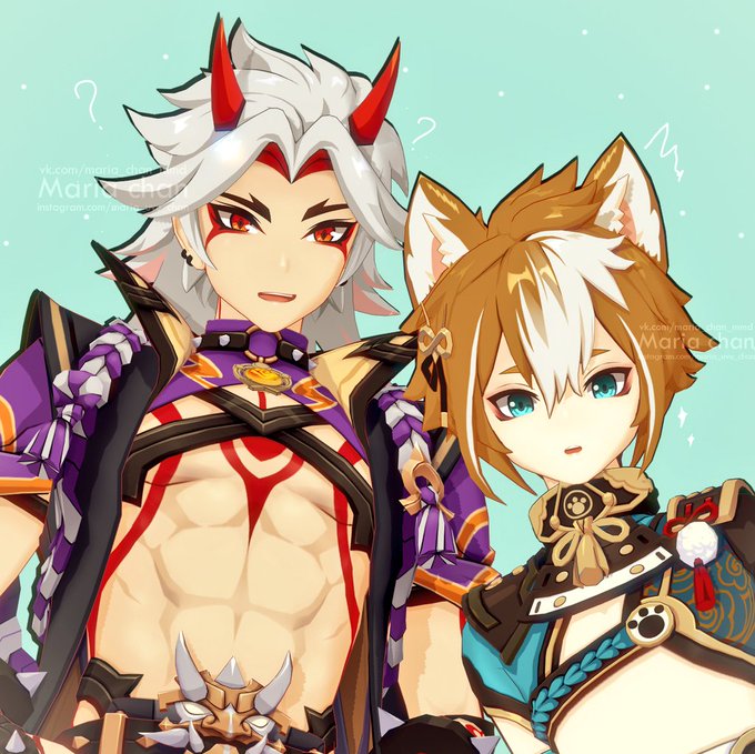 they just woke up after a long night of snuggling together 🫶🫶 sleepy boyfriends eheheh #genshinimpact #genshinimpactfanart #ittorou #ittoroufanart #ararakiitto #ittogenshinimpact #itto #gorougenshinimpact #gorou