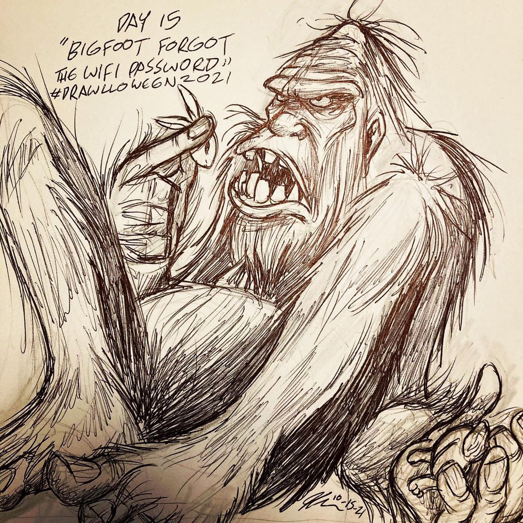 Day 15 of @drawlloween “Bigfoot Forgot The Wifi Password” #drawlloween2021 #jimmypurcelldrawlloween #sketch #bigfoot I didn’t really know what to draw for this one. So Bigfoot is bored eating a bunny.