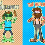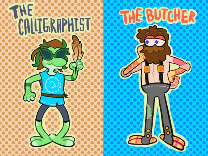 Beef is the butcher, and probably owns a business like Stumpy’s, and is known to play cards with the customers. Joe is a calligrapher, and takes care of the underground Town Archives 🥘🪶 [ #joehillsfanart #vintagebeeffanart ]