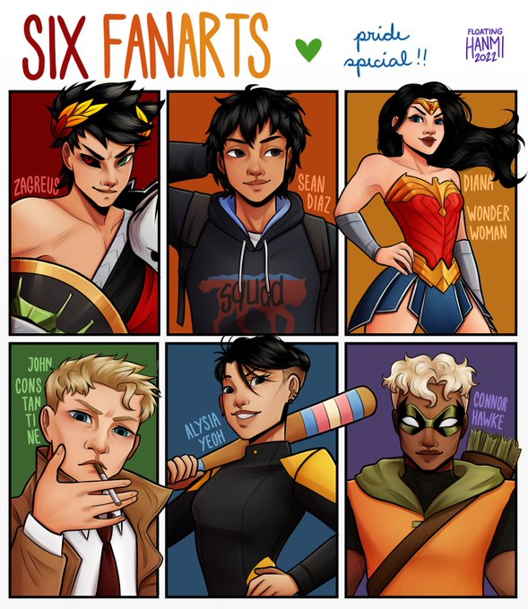 I'M LATE YEAH but here's part 1 of my #sixfanarts pride special 🏳️🌈🏳️⚧️ some of these are your suggestions and some are characters i really wanted to draw! keep an eye out for part 2 coming soon 👀 #zagreus #seandiaz #wonderwoman #johnconstantine #alysiayeoh #connorhawke