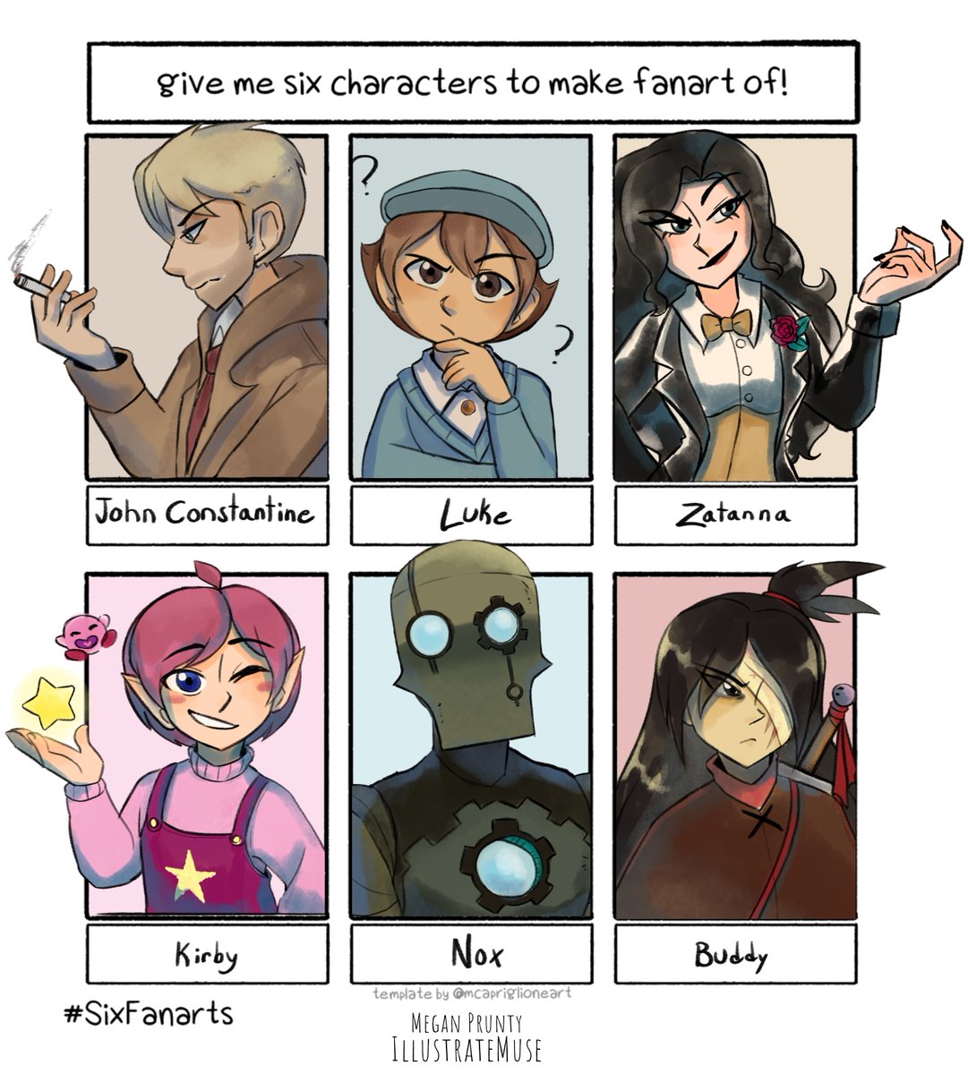 #SixFanarts round 2! Did these on stream recently to celebrate getting affiliate on Twitch! This batch was fun, thanks everyone for the support! :D #kirby #johnconstantine #zatanna #professorlayton #wakfu #LISA #artistsontwitter