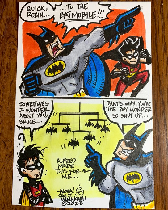 #dctuesday • 012423 • Batman & Robin • Get it? ^_^; •Keep smiling and stay safe, all :) #jonjmurakami #copic #copicmarkers #dc #dccomics #fanart #batman #robin #batmobile #mobile #btas