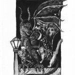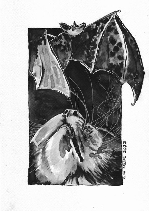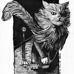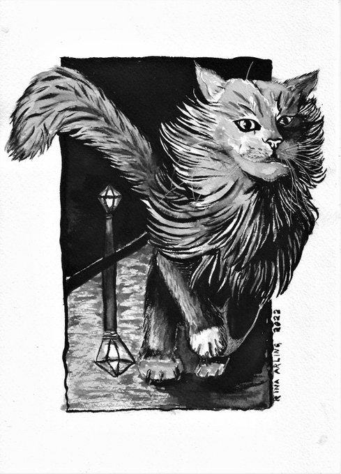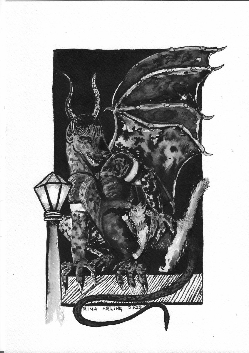 twitter #Inktober 2022, Day 1. Gargoyle. rinaarling.com instagram.com/rinaarlingart/ #inktober #drawing #painting #sketch #challenge #blackandwhite #ink #pentel #sakura #rina #arling #art #artist #jonny #gargoyle #cat #streetlight #wings #tail #protector #friends #night