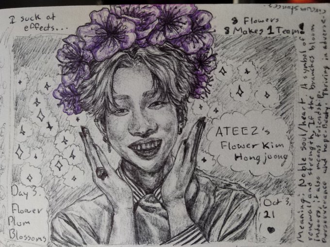 Day 3. Flower I looked up Ateez's flowers and saw that Ateez's birth flowers were Plum Blossoms. I thought that if I were to draw one member for it, it would have to be the leader, Kim Hongjoong 💜 #Inktober #k_inktober2021 #ATEEZfanart #ATEEZ #에이티즈