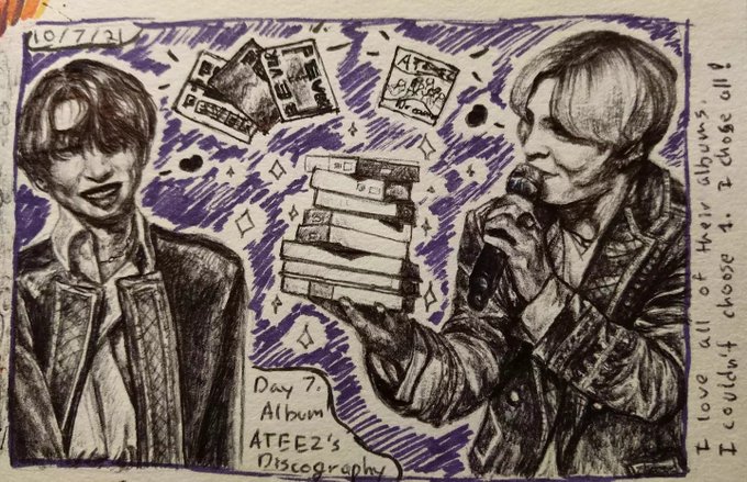Day 7. Album I already had the image in my mind when I saw the prompt. I wanted to draw the scene where Yunho was holding up their albums while performing One Day At A Time at their 2nd anniversary concert💜 #inktober #k_inktober2021 #ATEEZfanart #ATEEZ #에이티즈 @ATEEZofficial