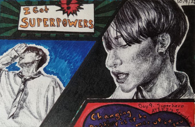 Day 9. Superhero Drew Seonghwa's part in Dreamers MV. I'm not great with comic style but I really tried to get the feel of it. I only wish I was better with fonts before I did this. #inktober #k_inktober2021 #ATEEZfanart #ATEEZ #에이티즈 @ATEEZofficial
