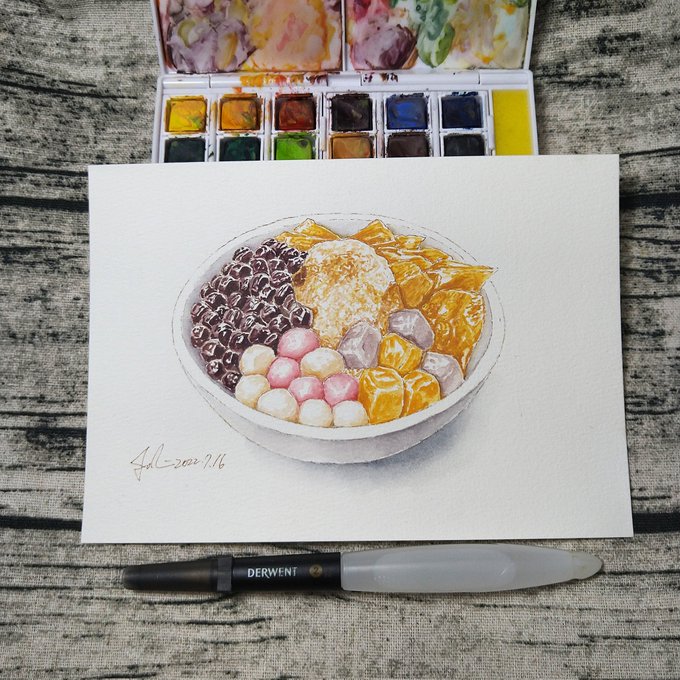 這麼熱的天氣就來畫一些冰😁,這是很特別的 #粳粽冰 ,在 #剉冰 裡面加 #鹼粽 ,感覺很適合❤️ #台灣美食 #刨冰 #芋圓 #珍珠 #湯圓 #甜點 #水彩 #美食 #插畫 #kakigori #shavedice #dessert #watercolor #watercolour #foodie #tapiocapearls #tapioca #taroballs #foodillustration #taiwanfood