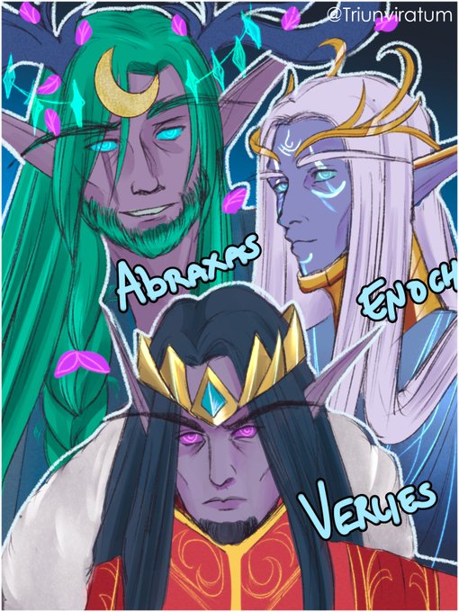 Llegaron los reyes elfos magos! Se me ocurrió anoche, que mejor que recibir los regalos de los hermanos Puestaluna uwu 🍃 Abraxas, el rey druida 🍃 ✨ Enoch, el rey astromante ✨ 💀 Verlies, el rey brujo 💀 #warcraft #warcraftfanart #nightelf #nightborne #kaldorei