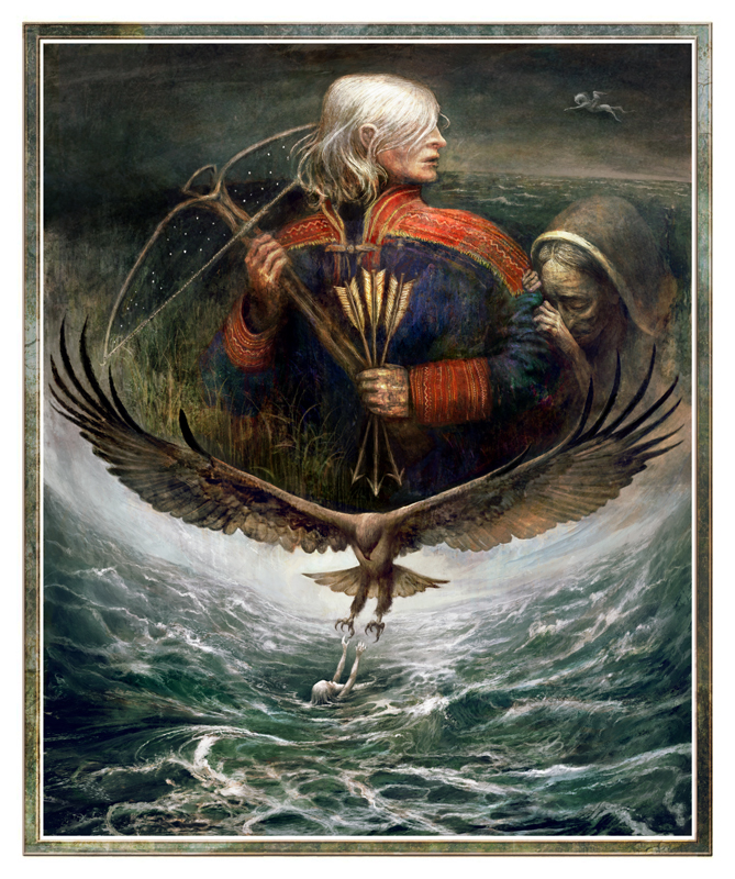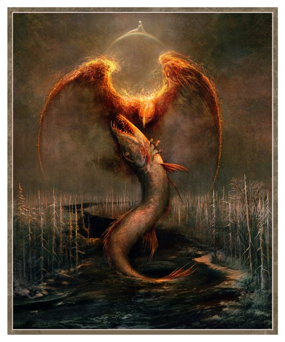 Ilmarinen's Trials - in which our hero conjures a fire eagle to capture the giant pike - the 3rd and last task before he can marry the maiden of the rainbow. From the #Kalevala, Finland's national epic. #digitalpainting Signed, Limited Edition book: eastonpress.com/deluxe-edition…