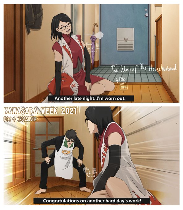 Day 4: Crossover #kawasara x Gokushufudou (The Way of The House-husband) I think Ex-yakuza House-husband fits Kawaki so well. As well with his super-busy Hokage Uchiha Sarada 🤭 #kawasaraweek2021 #kwsaweek2021 #カワサラ