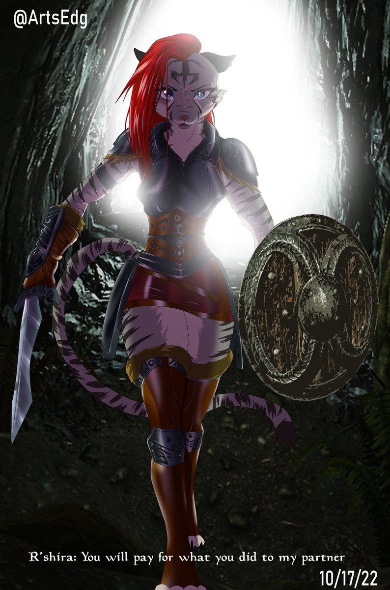 R'shira is my current character in Skyrim she used to be a bandit but a noble knight found her at the edge of dead and in the return she becomes his partner #skyrim #fanart #furryart #furries #bethesda #anime #khajiit #furryfandom #digitaldrawing #digitalartist #inktober2022
