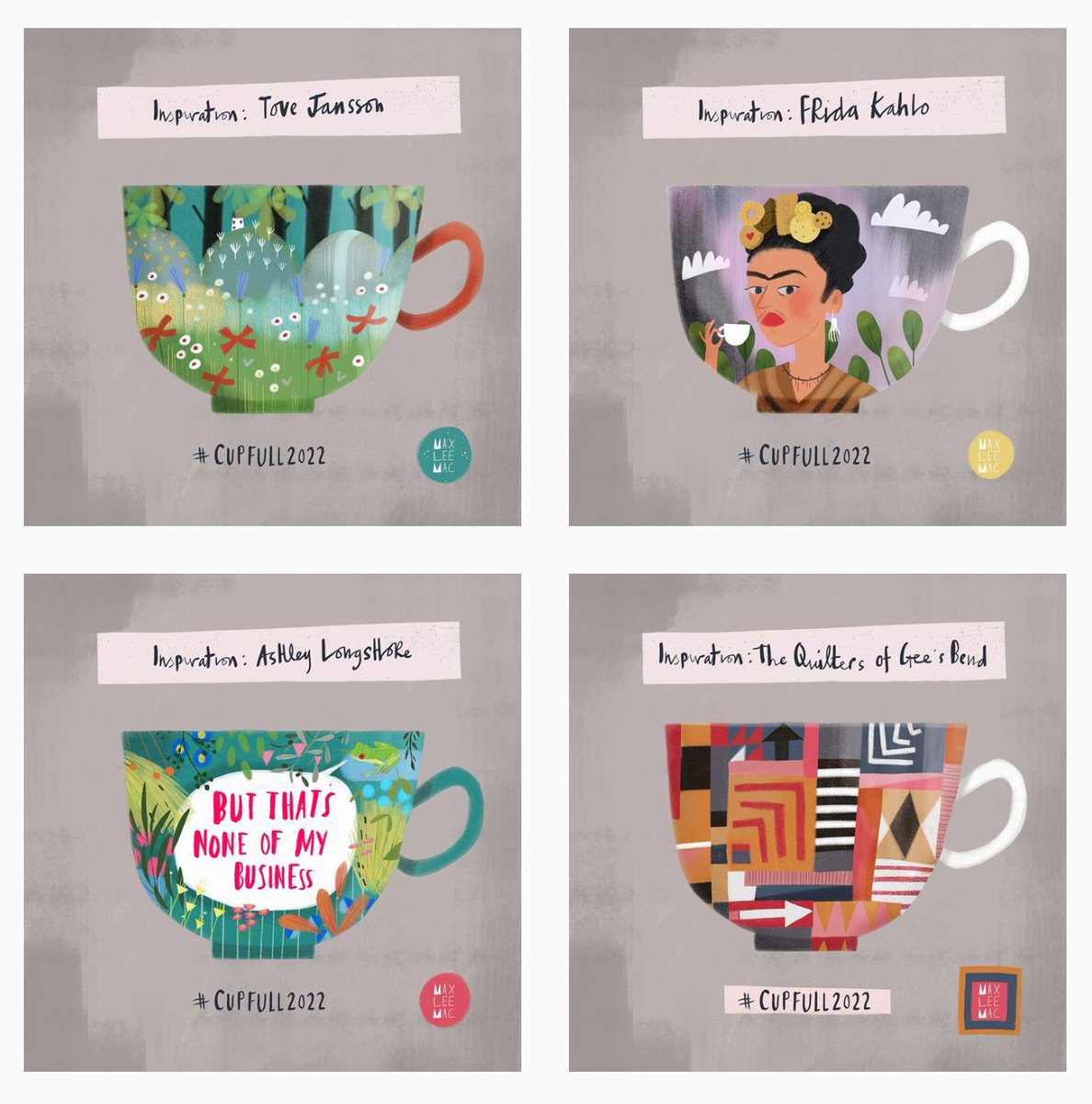 Some of my #cupfull #cupfull22 designs so far. Follow me on Instagram to keep up. 😊😊😊 instagram.com/maxineleemackie #illustration #art #kitchendecor