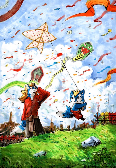 【Personal art】Kite Submission Art for @ThaiTails Omi is in Kite festival at Royal Park (Sanam Luang) 🪁🍃 It’s Bangkok Childhood outdoor activities around 20 years ago. #furryart #furryfandom #furryartist #inkart #traditionalart #furryartwork #omicrono #kite #thaitails