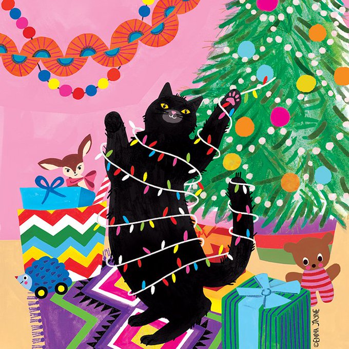 Mischievous kitty playing with the Christmas fairy lights 🐱🎄 We've not assembled our Xmas tree as yet. I'm wondering if my kitty, Willow, will be trying to climb up and play with the decorations, like she did last year! #christmas2022 #illustration #kittycat #kidlitart