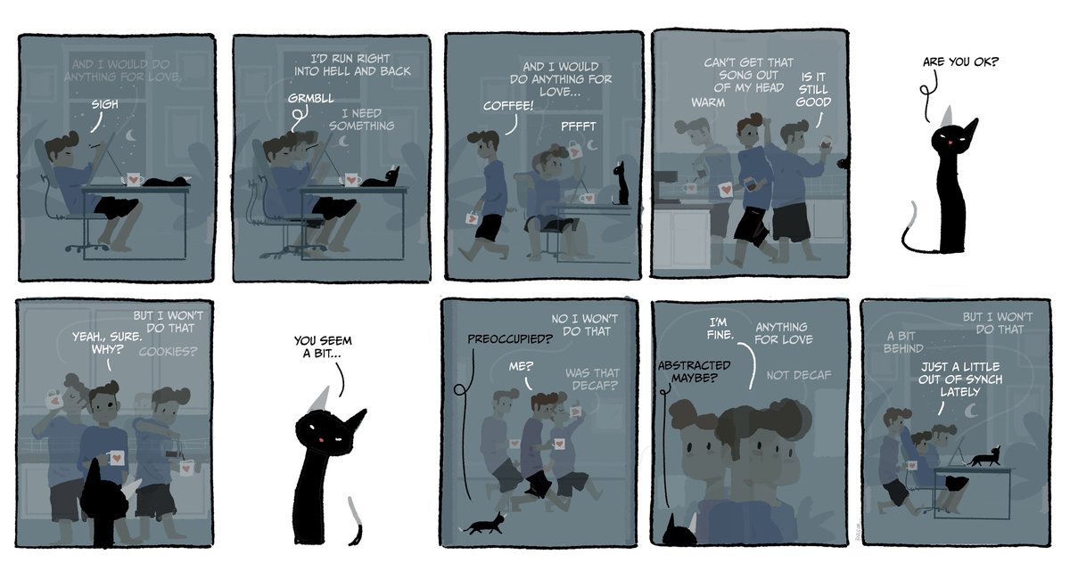 Synch For some reason, at the start of each new year, I get a little out of synch with myself. #pascalcampion #kittycatandmanlyman