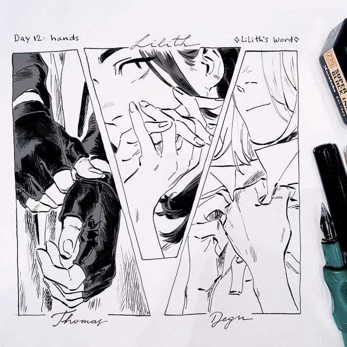 ✦ Day 12 of OCtober: hands✦ I just love drawing hands 😆 Tools: ZIG cartoonist super black ink 60, kuretake fudegokochi fine and extra-fine brushes (gray tone added digitally) #kuretake_inktober