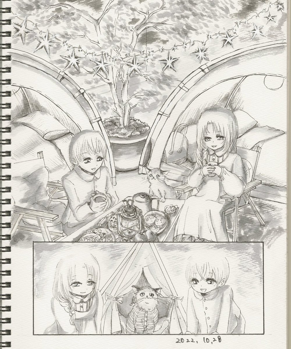インクトーバー28番目「CAMPING/キャンプ」ZIG Cartoonist Mangaka FLEXIBLEFine、顏彩耽美Graphite Colors四季ニュアンスラー ZIG CLEAN COLOR DOTで描きました。 #inktober #inktober2022 #kuretake_inktober #kuretake_inktober2022 #kuretake_inktober2022_giveaway #Inktober_PerfectChallenge