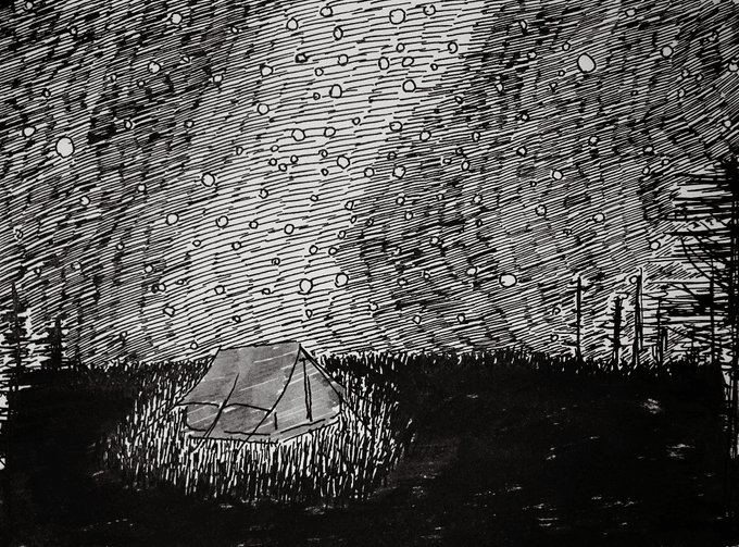 お題「camping」 標高1600mの空は明るく、テントの中は寒くて眠れなかった思い出。 使用画材 ・呉竹筆ごこち ・呉竹絵てがみ墨滴 ・copic画箋筆 ・ガラスペン #inktober #inktober2022 #inktober2022day28 #kuretake_inktober #kuretake_inktober2022 #kuretakeinktober2022_giveaway