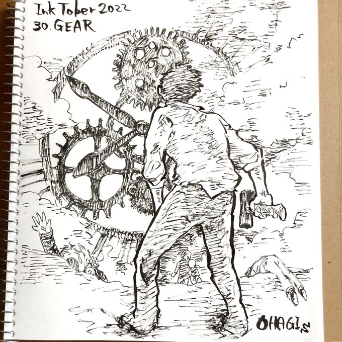 30日目gearのやり直し🙂 スチームパンクな本が読みたい🥹 今日はZIG MANGAKAペン、ZIG CREAN COLOR Real Brushで🖌 #inktober #inktober2022 #kuretake_inktober #kuretake_inktober2022 #Inktober_PerfectChallenge #kuretakeinktober2022_giveaway