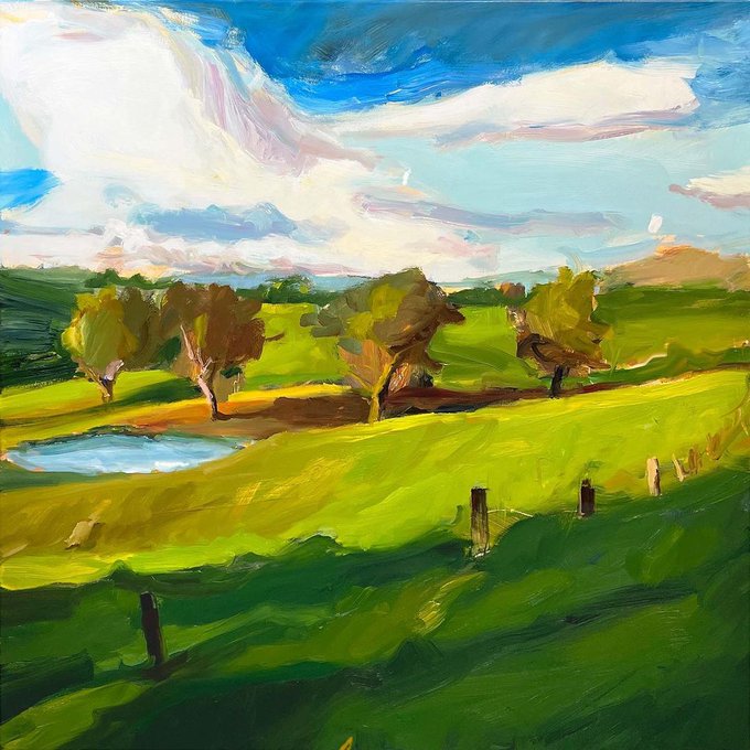 Back in the rolling hills of East Gippsland, where the afternoon light catches a hundred different shades of green… “Coming Home”, 85X85cm, oil on polycotton. #landscapepaintings #landscapeartists #landscapepainters #paintinglandscape #landscapeartist #outdoorpainting