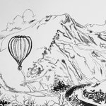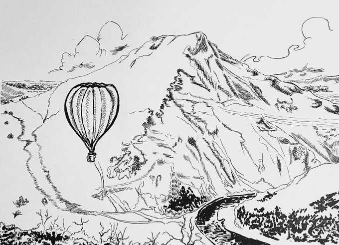 Inktober 2022- Day 07: Trip 🎈 @inktober #inktober #inktober2022 #ink #inkdrawing #inktoberchallenge #inktoberday7 #inktobertrip #trip #dailydrawing #airballoon #landscapedrawing #moutians #artistontwitter