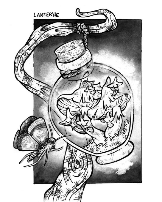 [#Inktober2022] Lanterne. Petite lanterne naturelle. Je trouve que ça ferait une bonne lumière au bout d'un bâton de druide ☺️ ! #Inktober #ink #InkDrawing #lanterne #lantern #mushrooms #CarnetàDessinMauve