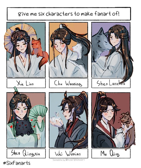My favorite buns and their pets. \(UwU\) #sixfanarts #xielian #chuwanning #lanzhou #shenqingqiu #weiwuxian #muqing #天官赐福 #将进酒 #二哈和他的白猫师尊 #人渣反派自救系统 #魔道祖师
