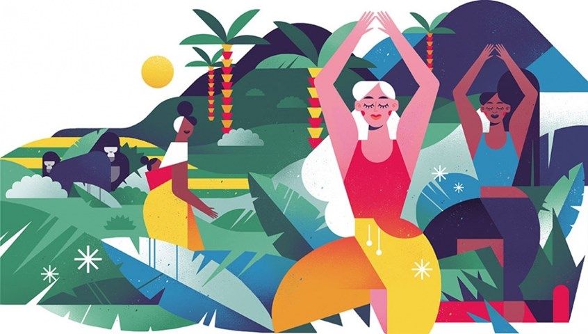 Editorial illustration by Kasia Serafin for a feature by b.Inspired Magazine's on female yoga retreats. Kasia is represented by @AGENCYRUSH Explore more: buff.ly/2BRRUWn #editorial #illustrator #illustration #magazine #vectorart #digital #stylized #leisure #lifestyle