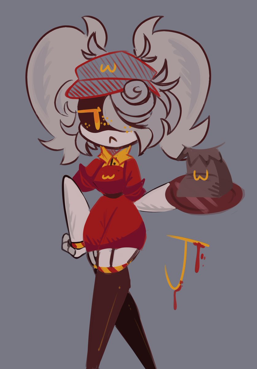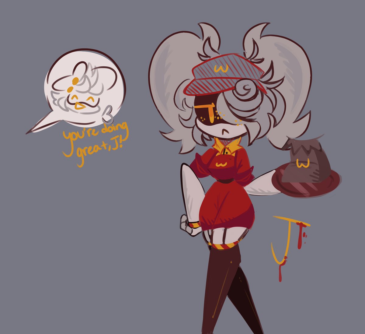 AU where J is reintroduced to Worker Society and is doing 'community service' (working at a McDonald's ripoff, lol) she's been de-clawed and de-tailed so she doesn't attack the karens :> #murderdrones #murderdronesfanart #smg4 #glitchproductions #liamvickersanimation #doodle